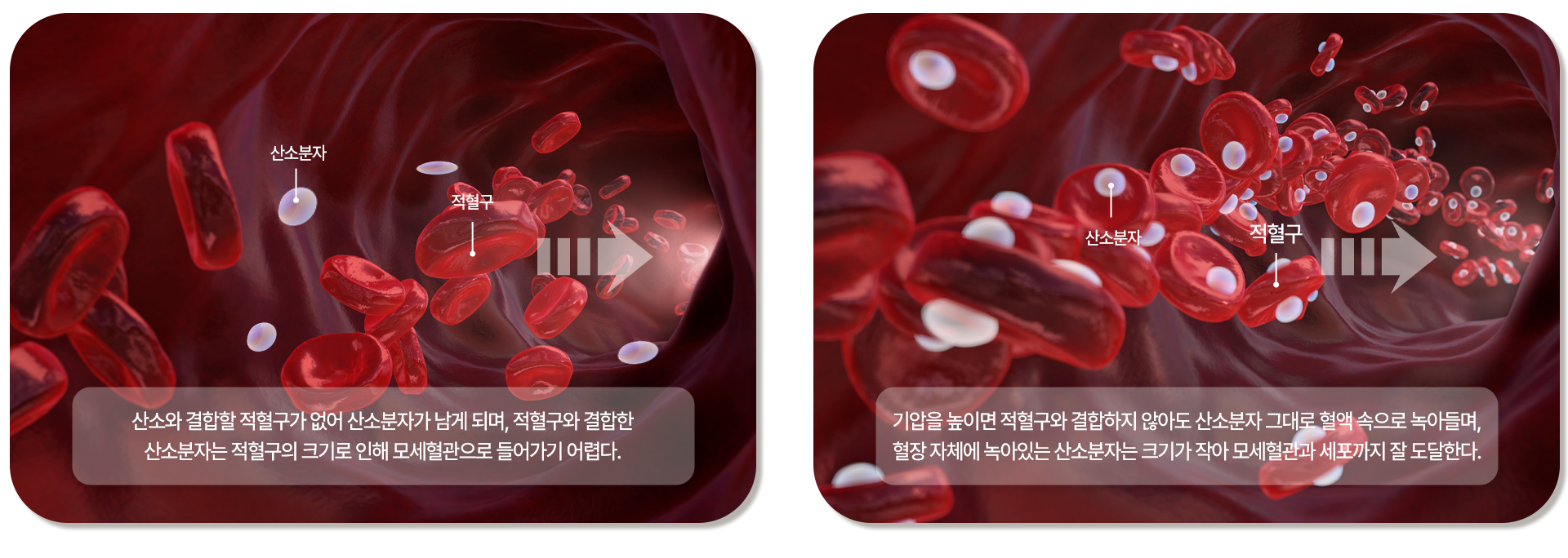 고압산소치료는 대기압보다 높은 2~3기압의 인위적인 고압 환경을 조성한